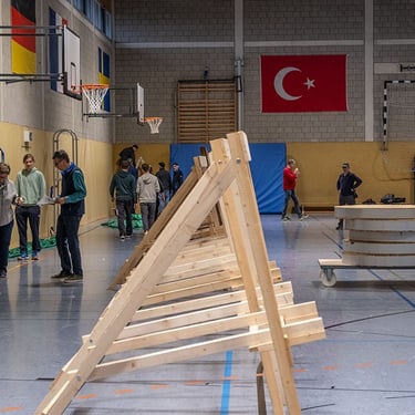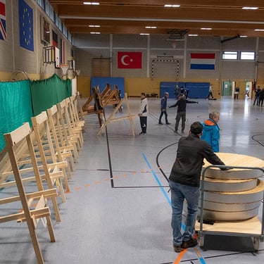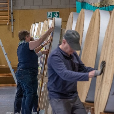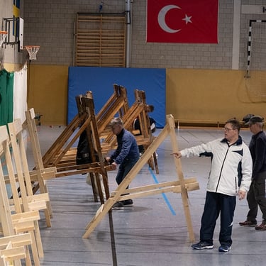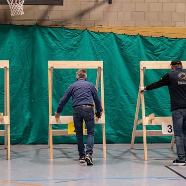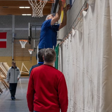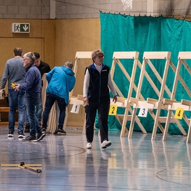 Aufbau zur Bezirksmeisterschaft in der Dietmar-Müller Halle in Bedburg Hau. Viele fleißige Helfer haben auch in diesem Jahr wieder dazu beigetragen, dass die Bezirksmeisterschaft in der Halle ausgetragen werden konnte. Fotos Kurt Michelis